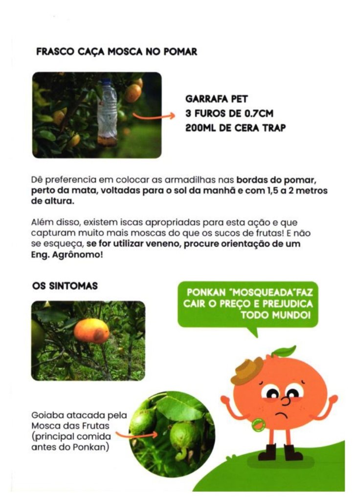 Instalação de armadilhas que podem ser feitas com garrafas pet com suco de frutas (uva, laranja, maracujá, etc.) ou atrativo alimentar comercial que pode ser encontrado em diversas agropecuárias do município, principalmente em plantações, árvores frutíferas ou reservas de mata que estejam com frutos maduros próximas aos pomares, por exemplo as goiabeiras, ameixeiras, abóbora, etc., e também nas bordas dos pomares de ponkan (primeiras linhas) próximas a esses locais, fique atento.