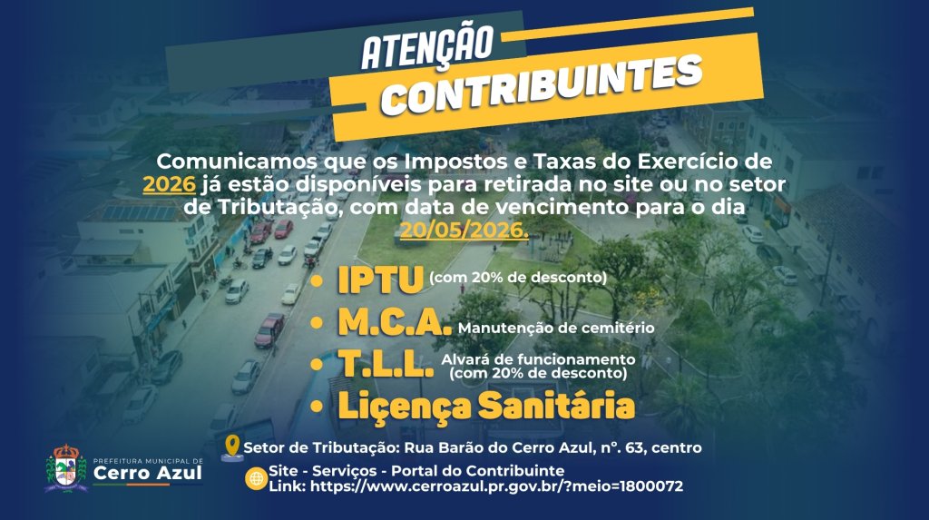 A Prefeitura Municipal de Cerro Azul informa a todos os contribuintes que os Impostos e Taxas referentes ao Exercício de 2026 já estão disponíveis para retirada. Os documentos podem ser acessados tanto pelo site oficial da prefeitura quanto diretamente no setor de Tributação.